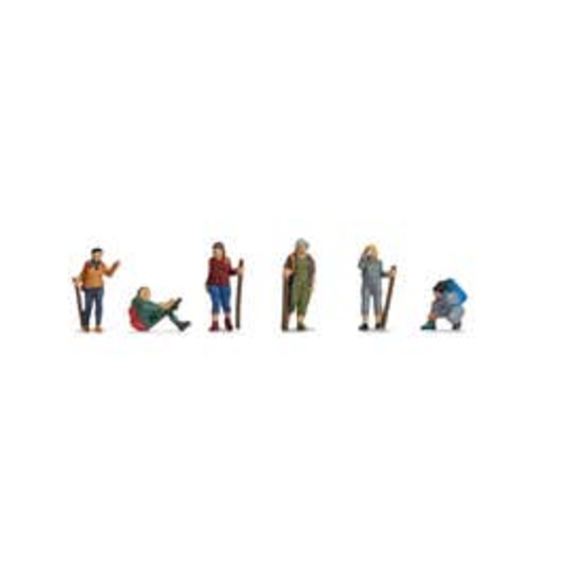 Recovery on the pilgrimage! The figure set for H0 gauge contains six people on the theme of pilgrimage. They are all dressed for the occasion, carrying sticks or wearing hats and backpacks. A man with a sleeping mat on his back is kneeling down to tie his