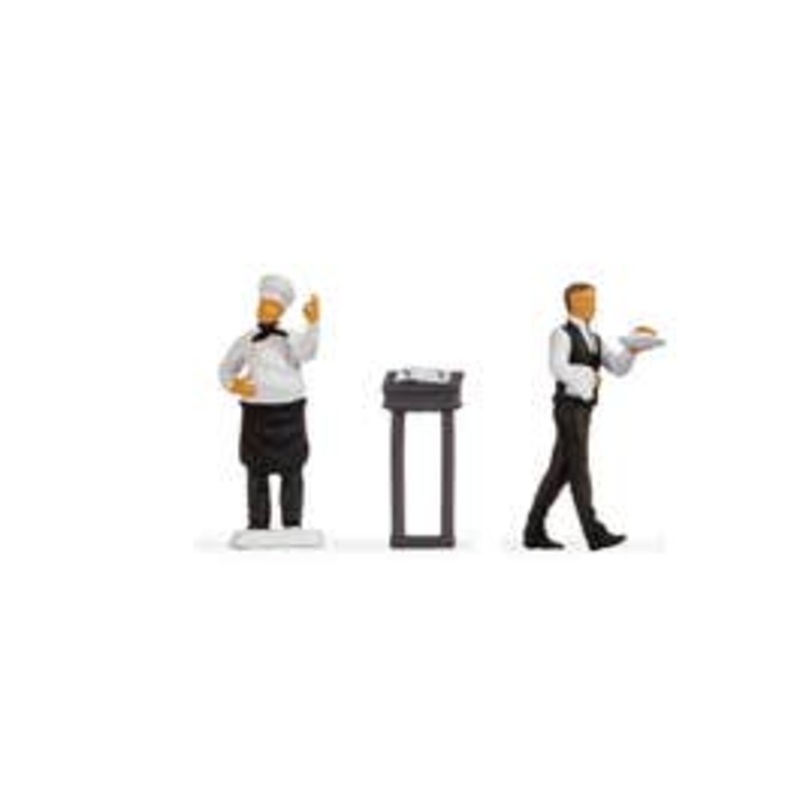 Bon apptit! With the Tiny Scenes, you can create a realistic city scene with a small restaurant on your model landscape.This scene includes a pot-bellied chef dressed in black and white with a chef's hat, a waiter, also in smart black and white, and a smal